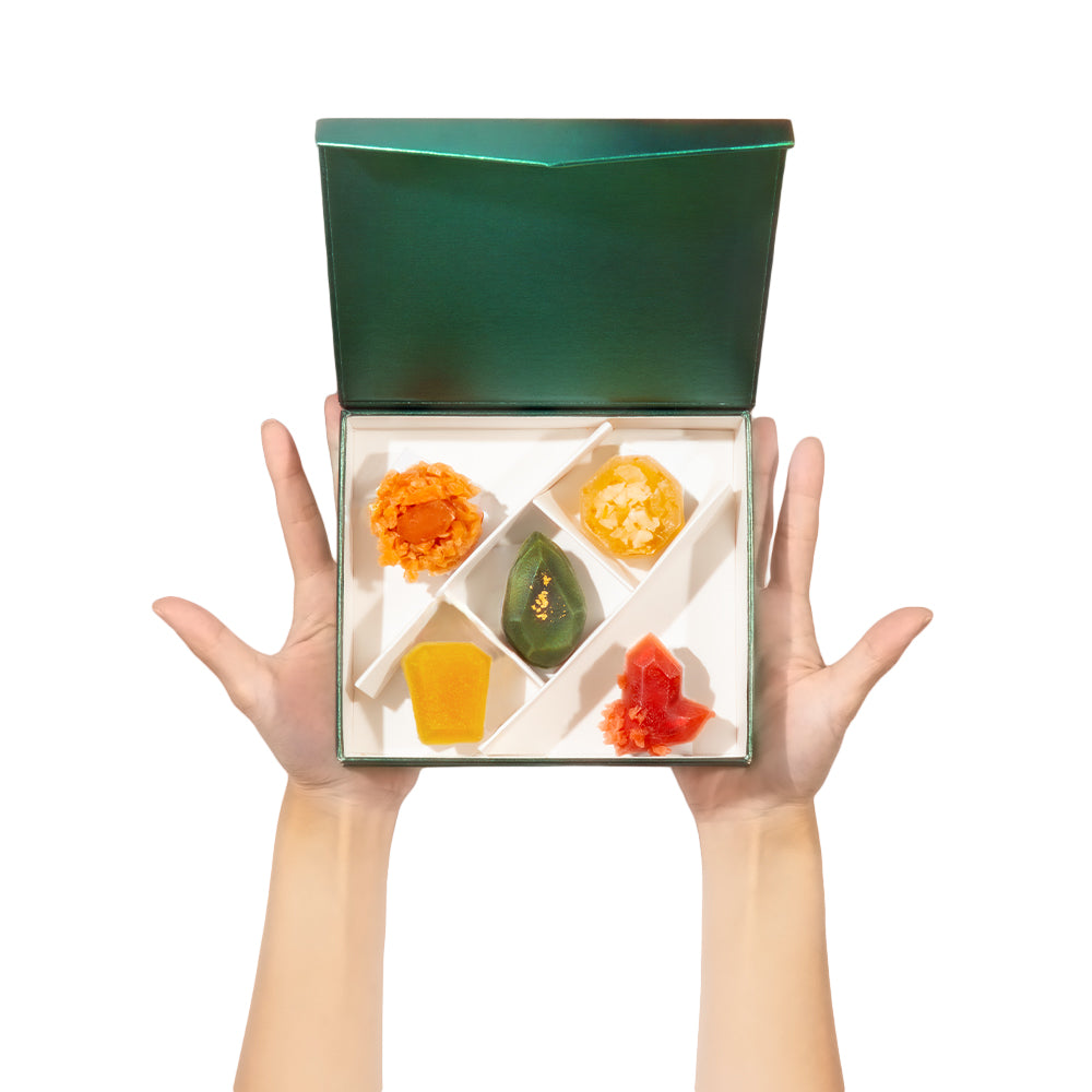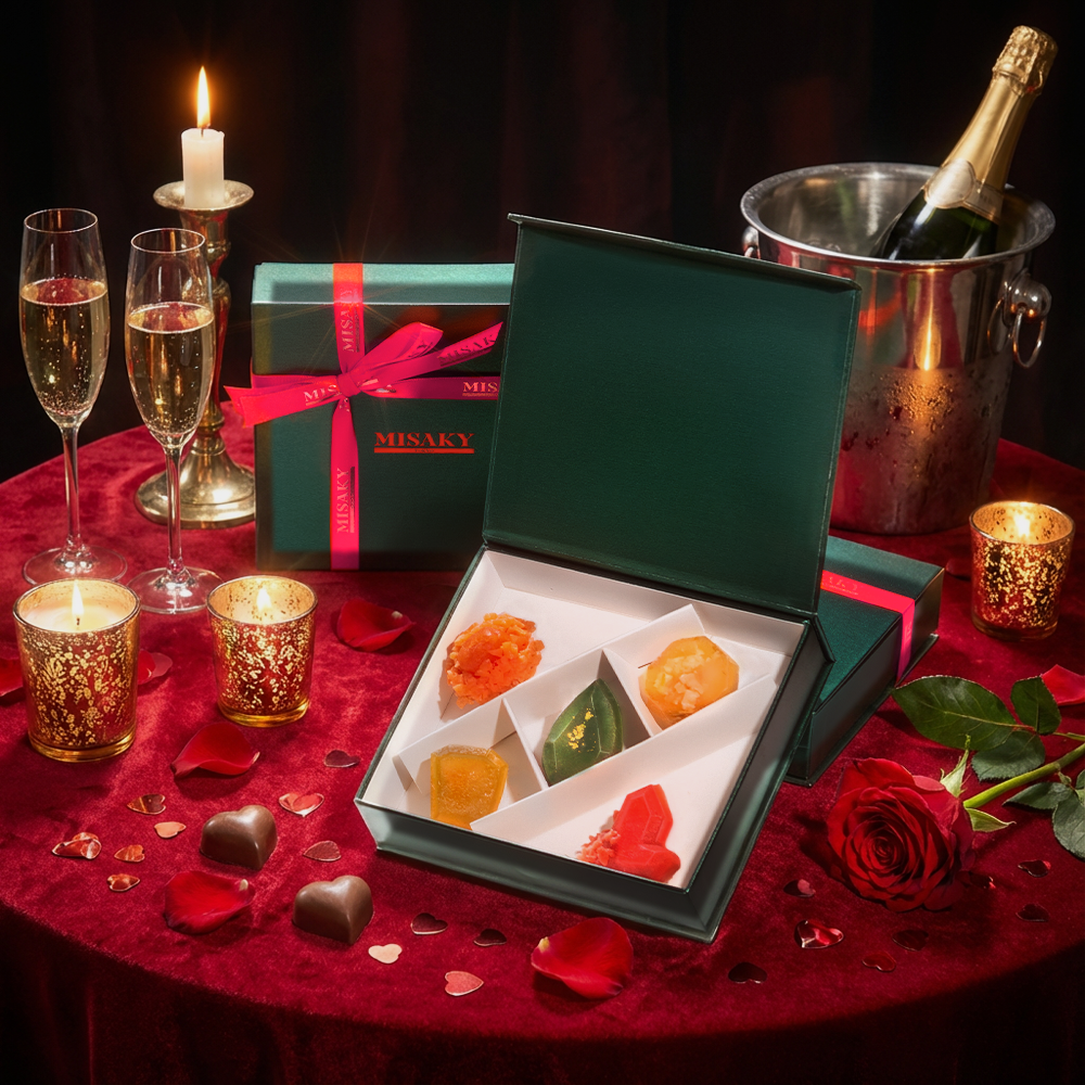 Celebrate the season with a curated collection of Misaky’s handcrafted crystal candies. Each Gem Box features five edible jewels, created one by one using traditional techniques, natural ingredients, and the slow craftsmanship that gives every crystal its signature crisp exterior and chewy center.